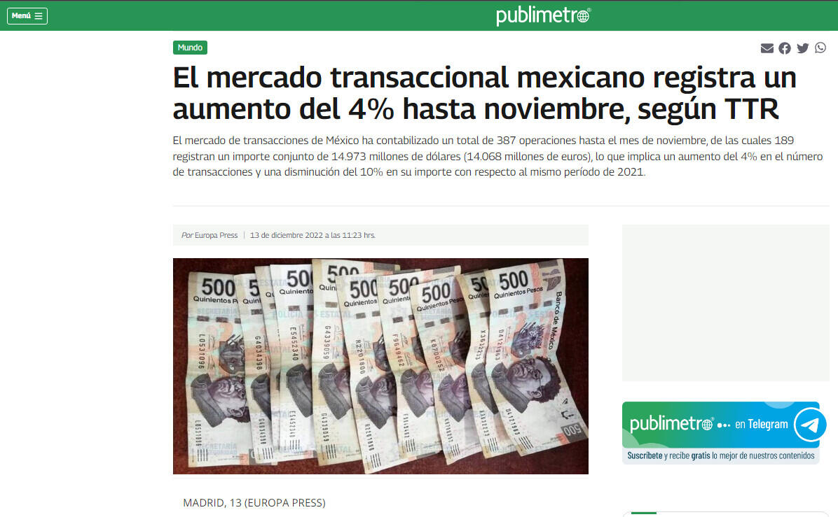 El mercado transaccional mexicano registra un aumento del 4% hasta noviembre, según TTR