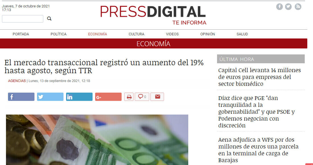 El mercado transaccional registró un aumento del 19% hasta agosto, según TTR