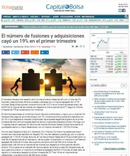 En el mercado de capitales español se cerraron en los tres primeros meses de 2018 tres salidas a Bolsa y siete ampliaciones de capital. En el primer trimestre de 2018, TTR ha seleccionado como transacción destacada la adquisición por parte de Allianz Capital Partners y CPPIB - Canada Pension Plan Investment Board del 20% del negocio de distribución de gas natural de Gas Natural Fenosa. La operación, valorada en 1.500 millones, fue asesorada en la parte legal por Bird & Bird España, PwC, Uría Menéndez, Freshfields Bruckhaus Deringer España, y KPMG Abogados. Por la parte financiera, la transacción fue asesorada por JP Morgan, Morgan Stanley, y PwC. El vicepresidente de Desarrollo de Negocio Estratégico de Intralinks, Philip Whitchelo, ha comentado que España tiene un mercado de fusiones y adquisiciones "relativamente abierto y cuenta con la mayor parte de las operaciones M&A industriales, inmobiliarias y energéticas de los cinco países más importantes de la Unión Europea".