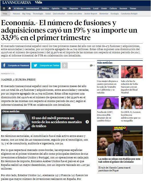 El mercado transaccional español cerró los tres primeros meses del año con un total de 473 fusiones y adquisiciones, entre anunciadas y cerradas, por un importe agregado de 14.709 millones. Estas cifras suponen una disminución del 19,01% en el número de operaciones y del 33,90% en el importe de las mismas con respecto al mismo periodo de 2017, según el informe trimestral de TTR en colaboración con Intralinks.