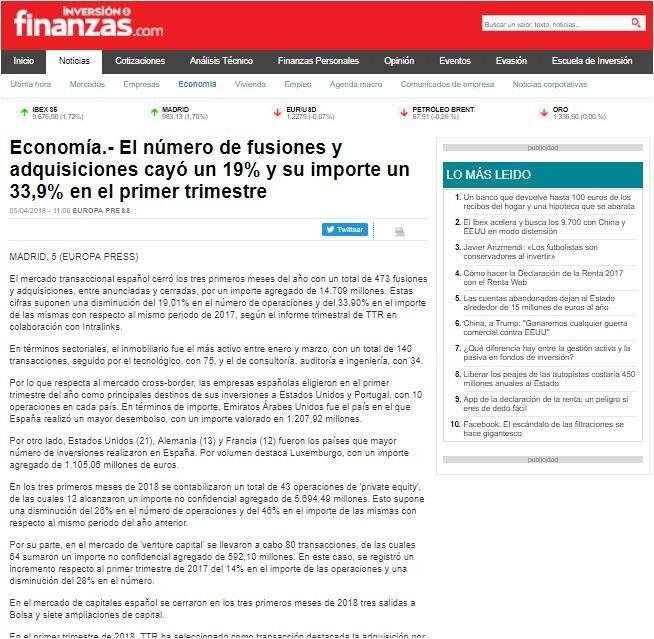 El mercado transaccional español cerró los tres primeros meses del año con un total de 473 fusiones y adquisiciones, entre anunciadas y cerradas, por un importe agregado de 14.709 millones. Estas cifras suponen una disminución del 19,01% en el número de operaciones y del 33,90% en el importe de las mismas con respecto al mismo periodo de 2017, según el informe trimestral de TTR en colaboración con Intralinks.