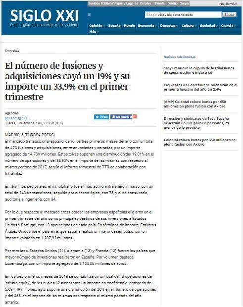 El mercado transaccional español cerró los tres primeros meses del año con un total de 473 fusiones y adquisiciones, entre anunciadas y cerradas, por un importe agregado de 14.709 millones. Estas cifras suponen una disminución del 19,01% en el número de operaciones y del 33,90% en el importe de las mismas con respecto al mismo periodo de 2017, según el informe trimestral de TTR en colaboración con Intralinks.