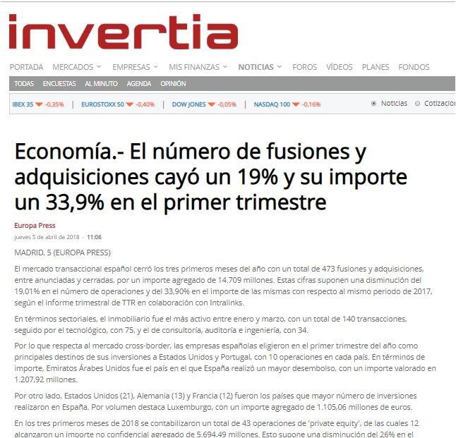 El mercado transaccional español cerró los tres primeros meses del año con un total de 473 fusiones y adquisiciones, entre anunciadas y cerradas, por un importe agregado de 14.709 millones. Estas cifras suponen una disminución del 19,01% en el número de operaciones y del 33,90% en el importe de las mismas con respecto al mismo periodo de 2017, según el informe trimestral de TTR en colaboración con Intralinks.