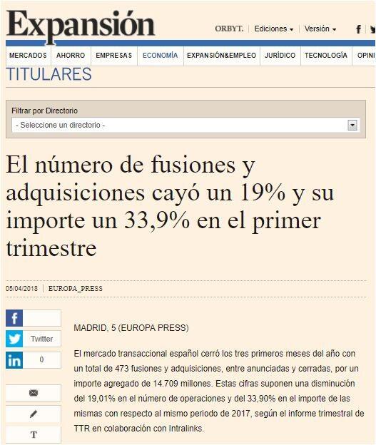 El mercado transaccional español cerró los tres primeros meses del año con un total de 473 fusiones y adquisiciones, entre anunciadas y cerradas, por un importe agregado de 14.709 millones. Estas cifras suponen una disminución del 19,01% en el número de operaciones y del 33,90% en el importe de las mismas con respecto al mismo periodo de 2017, según el informe trimestral de TTR en colaboración con Intralinks.