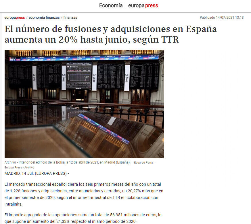 El mercado transaccional español cierra los seis primeros meses del año con un total de 1.228 fusiones y adquisiciones, entre anunciadas y cerradas, un 20,27% más que en el primer semestre de 2020, según el informe trimestral de TTR en colaboración con Intralinks.