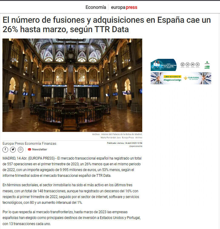 MADRID, 14 Abr. (EUROPA PRESS) -El mercado transaccional español ha registrado un total de 557 operaciones en el primer trimestre de 2023, un 26% menos que en el mismo periodo de 2022, con un importe agregado de 9.995 millones de euros, un 53% menos, según el informe trimestral sobre el mercado transaccional español de TTR Data.