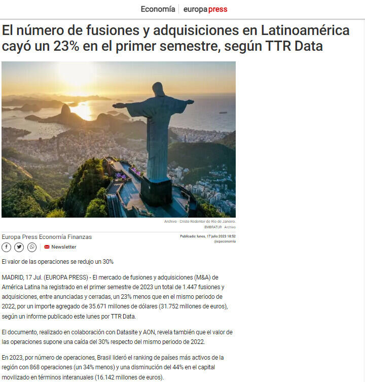 MADRID, 17 Jul. (EUROPA PRESS) - El mercado de fusiones y adquisiciones (M&A) de América Latina ha registrado en el primer semestre de 2023 un total de 1.447 fusiones y adquisiciones, entre anunciadas y cerradas, un 23% menos que en el mismo periodo de 2022, por un importe agregado de 35.671 millones de dólares (31.752 millones de euros), según un informe publicado este lunes por TTR Data.