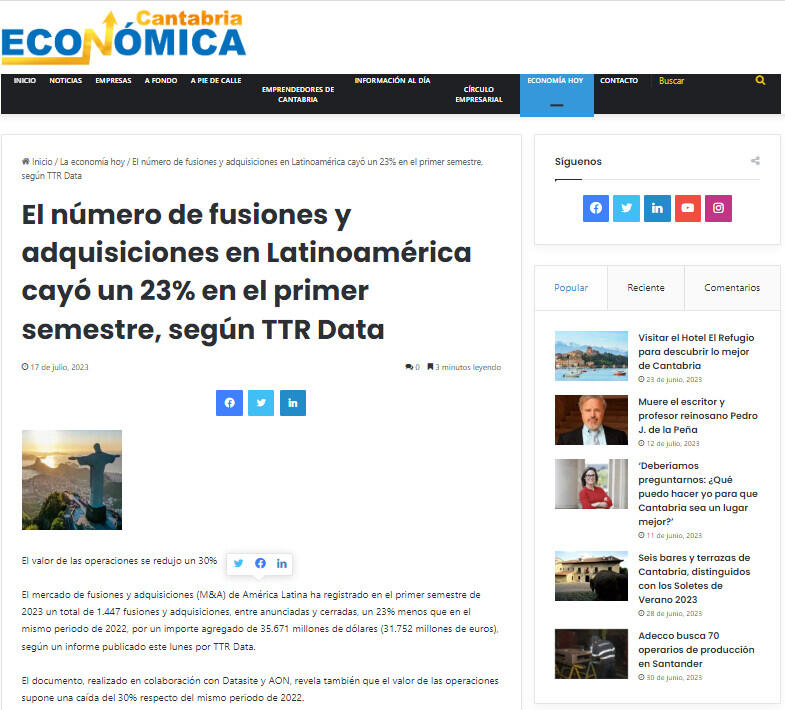 El número de fusiones y adquisiciones en Latinoamérica cayó un 23% en el primer semestre, según TTR Data