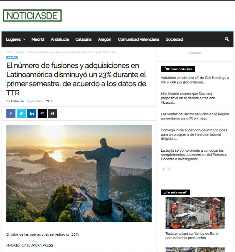 El número de fusiones y adquisiciones en Latinoamérica disminuyó un 23% durante el primer semestre, de acuerdo a los datos de TTR