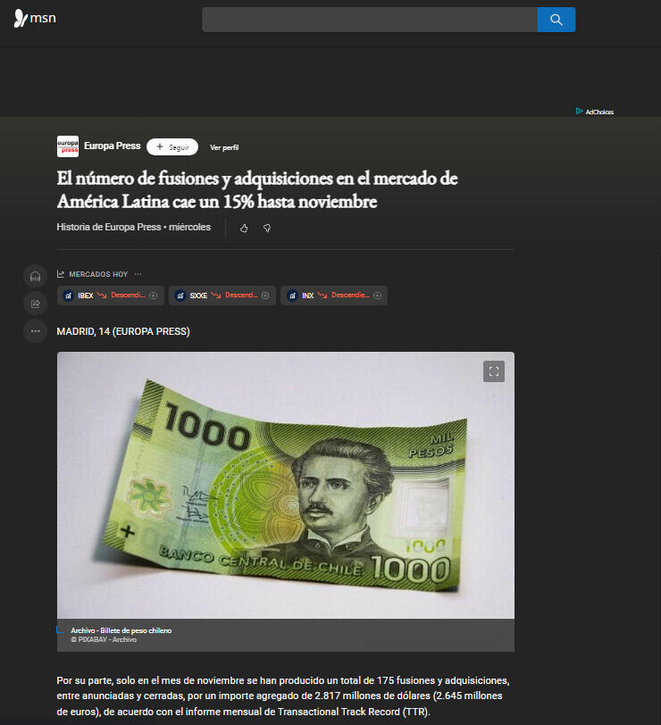 A su vez, Chile ha mejorado su posición en el ranking, con 280 transacciones (un 13% menos), aunque desciende el capital movilizado en un 11%, hasta 13.737 millones de dólares (12.900 millones de euros). Colombia ha subido de puesto, tras aumentar un 2% sus transacciones hasta noviembre y pese a movilizar un 23% menos de capital, alcanzando los 9.215 millones de dólares (8.653 millones de euros).