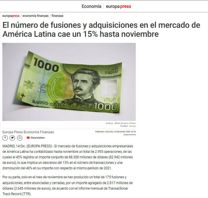 MADRID, 14 Dic. (EUROPA PRESS) - El mercado de fusiones y adquisiciones empresariales de América Latina ha contabilizado hasta noviembre un total de 2.955 operaciones, de las cuales el 45% registra un importe conjunto de 88.308 millones de dólares (82.942 millones de euros), lo que implica un descenso del 15% en el número de transacciones y una disminución del 40% en su importe con respecto al mismo período de 2021.