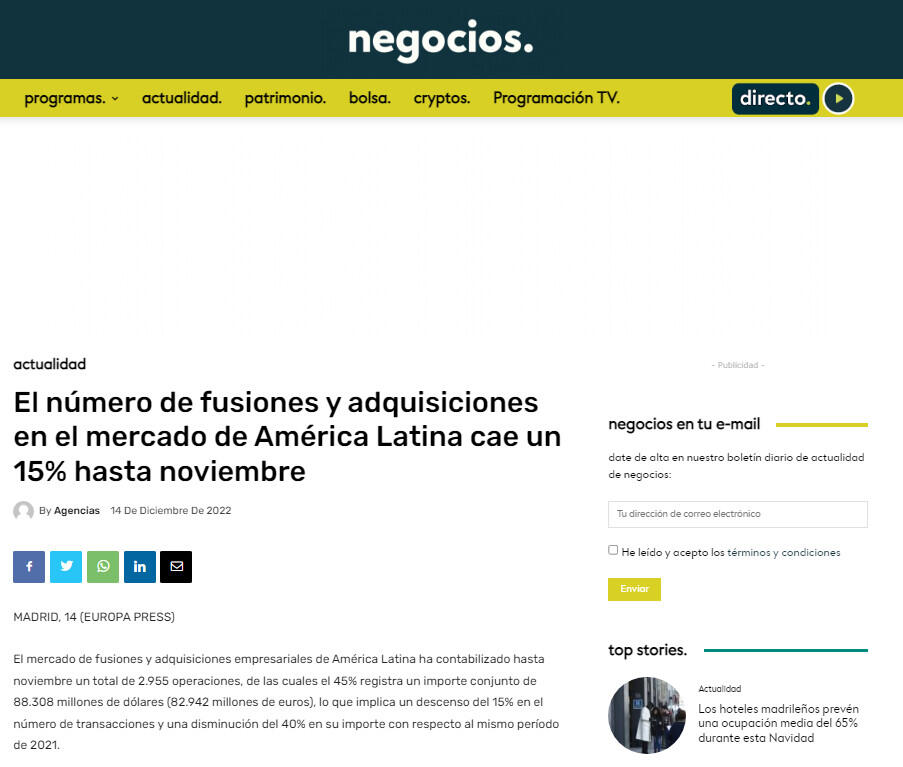 El mercado de fusiones y adquisiciones empresariales de América Latina ha contabilizado hasta noviembre un total de 2.955 operaciones, de las cuales el 45% registra un importe conjunto de 88.308 millones de dólares (82.942 millones de euros), lo que implica un descenso del 15% en el número de transacciones y una disminución del 40% en su importe con respecto al mismo período de 2021.
