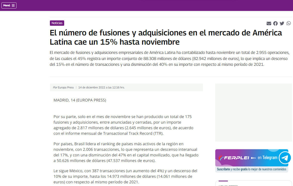 El mercado de fusiones y adquisiciones empresariales de América Latina ha contabilizado hasta noviembre un total de 2.955 operaciones, de las cuales el 45% registra un importe conjunto de 88.308 millones de dólares (82.942 millones de euros), lo que implica un descenso del 15% en el número de transacciones y una disminución del 40% en su importe con respecto al mismo período de 2021.