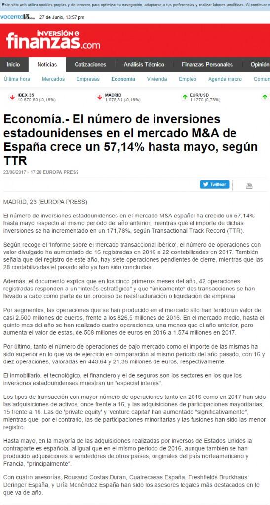 El número de inversiones estadounidenses en el mercado M&A español ha crecido un 57,14% hasta mayo respecto al mismo periodo del año anterior, mientras que el importe de dichas inversiones se ha incrementado en un 171,78%, según Transactional Track Record (TTR).