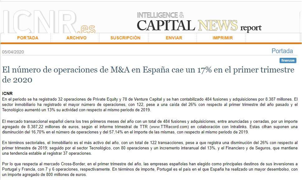 El mercado transaccional español cierra los tres primeros meses del año con un total de 484 fusiones y adquisiciones, entre anunciadas y cerradas, por un importe agregado de 8.387,22 millones de euros, según el informe trimestral de TTR (www.TTRecord.com) en colaboración con Intralinks. Estas cifran suponen una disminución del 16,70% en el número de operaciones y del 57,14% en el importe de las mismas, con respecto al mismo periodo de 2019.