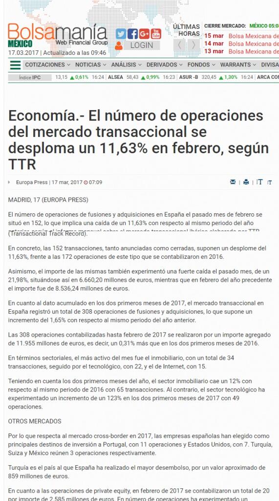 En cuanto al dato acumulado en los dos primeros meses de 2017, el mercado transaccional en España registró un total de 308 operaciones de fusiones y adquisiciones, lo que supone un incremento del 1,65% con respecto al mismo periodo del año anterior.