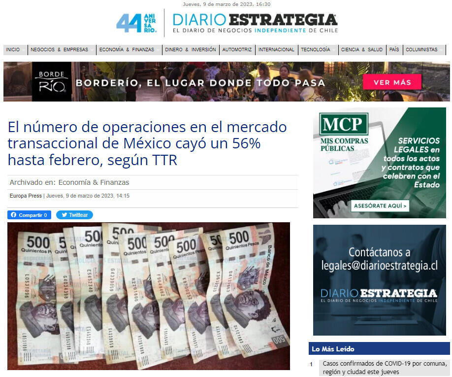 El número de operaciones en el mercado transaccional de México cayó un 56% hasta febrero, según TTR