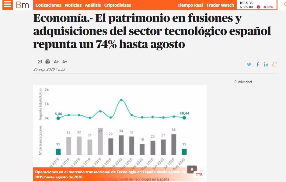 El patrimonio movilizado en las operaciones de fusiones y adquisiciones del sector tecnológico español ha repuntado un 74% en los primeros ocho meses del año, hasta los 1.971 millones de euros, con lo que es "uno de los sectores más activos en el mercado ibérico", según TTR.