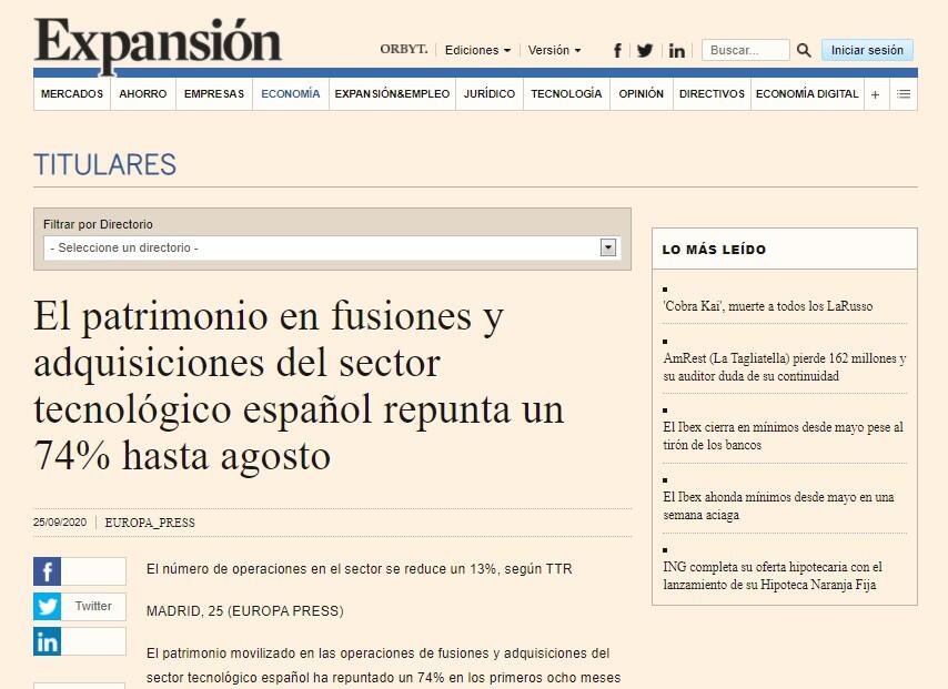 El patrimonio movilizado en las operaciones de fusiones y adquisiciones del sector tecnológico español ha repuntado un 74% en los primeros ocho meses del año, hasta los 1.971 millones de euros, con lo que es "uno de los sectores más activos en el mercado ibérico", según TTR.