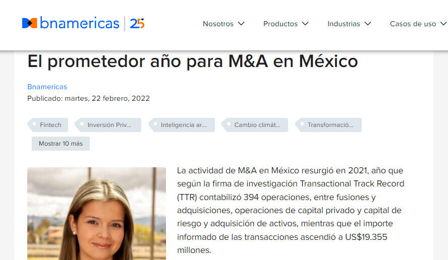 La actividad de M&A en México resurgió en 2021, año que según la firma de investigación Transactional Track Record (TTR) contabilizó 394 operaciones, entre fusiones y adquisiciones, operaciones de capital privado y capital de riesgo y adquisición de activos, mientras que el importe informado de las transacciones ascendió a US$19.355 millones.