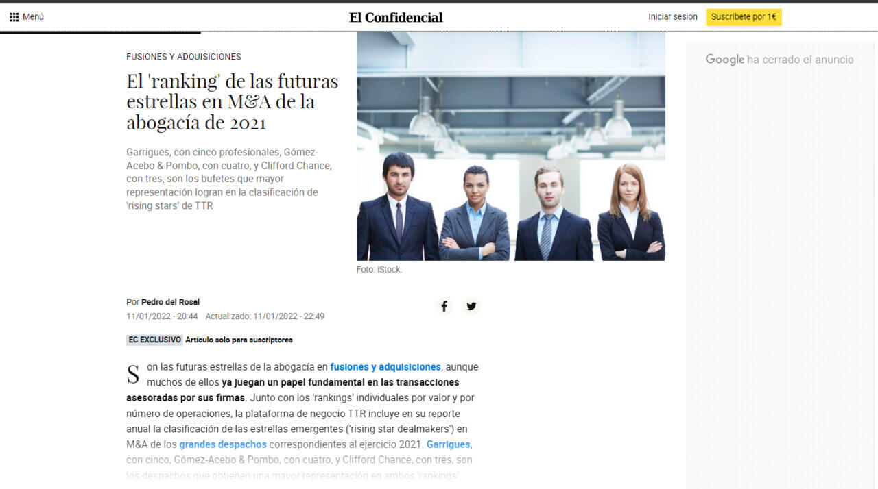 Son las futuras estrellas de la abogacía en fusiones y adquisiciones, aunque muchos de ellos ya juegan un papel fundamental en las transacciones asesoradas por sus firmas. Junto con los 'rankings' individuales por valor y por número de operaciones, la plataforma de negocio TTR incluye en su reporte anual la clasificación de las estrellas emergentes ('rising star dealmakers') en M&A de los grandes despachos correspondientes al ejercicio 2021. Garrigues, con cinco, Gómez-Acebo & Pombo, con cuatro, y Clifford Chance, con tres, son los despachos que obtienen una mayor representación en ambos 'rankings'.