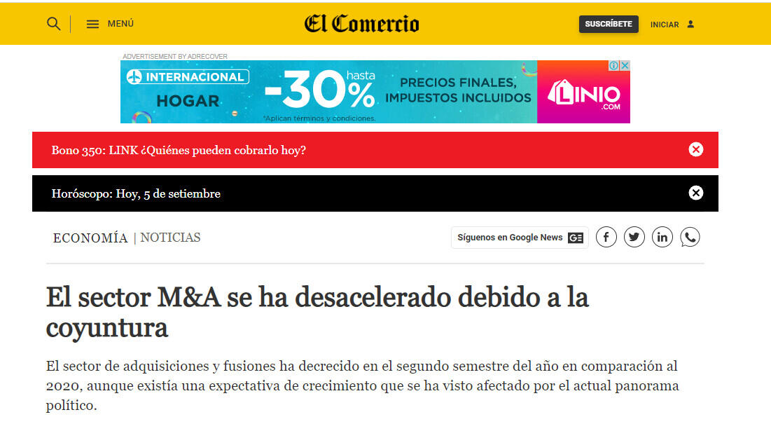 El sector de adquisiciones y fusiones, conocido como M&A, ha visto una desaceleración en sus operaciones durante el segundo semestre del año en comparación al 2020. Aunque de acuerdo a la abogada Kiomi Osorio, asociada senior de la firma internacional Cuatrecasas, existía una expectativa de crecimiento, el actual panorama político ha afectado al sector.