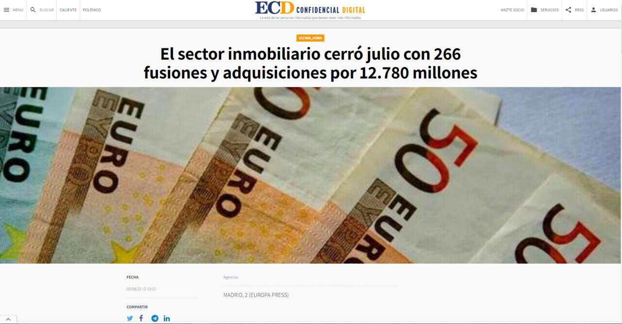 Solo en julio se contabilizaron un total de 40 operaciones en el sector inmobiliario, por valor de 1.446,49 millones, si bien enero sigue siendo el mes más activo en el sector en lo que va de año.