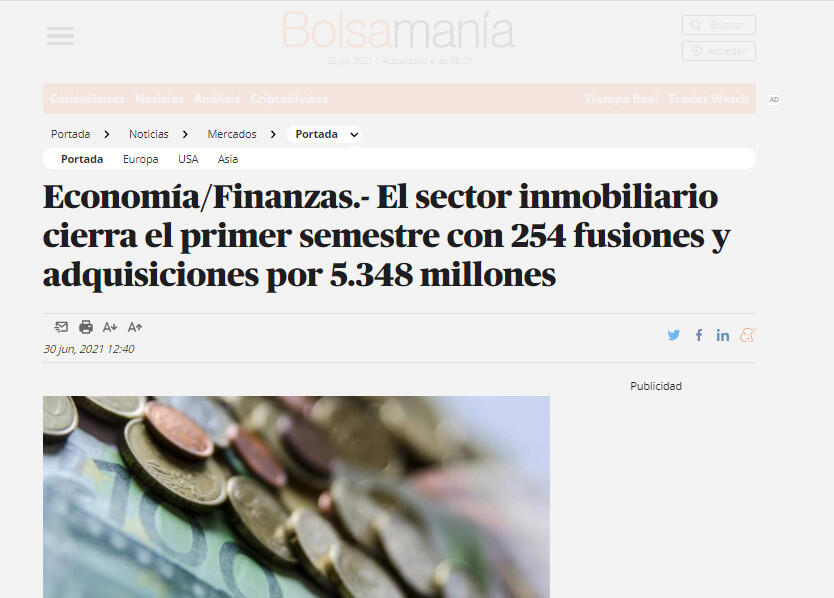El sector inmobiliario cierra el primer semestre con 254 fusiones y adquisiciones por 5.348 millones