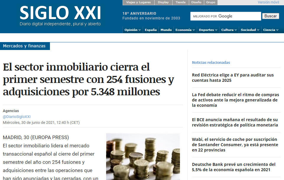 El sector inmobiliario lidera el mercado transaccional español al cierre del primer semestre del año con 254 fusiones y adquisiciones entre las operaciones que han sido anunciadas y las cerradas, con un importe agregado de 5.348 millones de euros, según datos de Transactional Track Record (TTR).