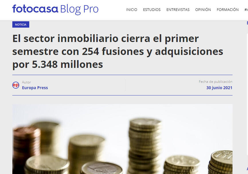 El sector inmobiliario cierra el primer semestre con 254 fusiones y adquisiciones por 5.348 millones