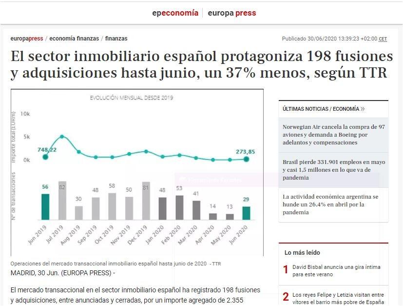 El mercado transaccional en el sector inmobiliario español ha registrado 198 fusiones y adquisiciones, entre anunciadas y cerradas, por un importe agregado de 2.355 millones de euros, en el primer semestre, según datos de Transactional Track Record (TTR).