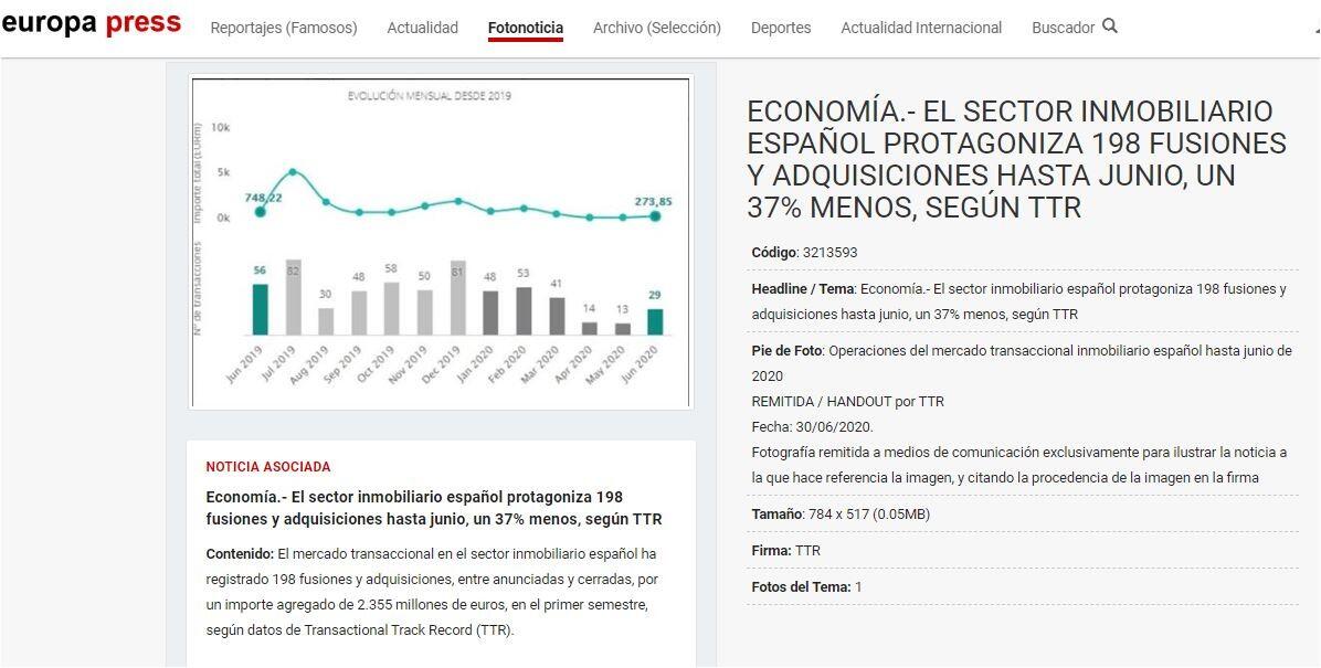 El mercado transaccional en el sector inmobiliario español ha registrado 198 fusiones y adquisiciones, entre anunciadas y cerradas, por un importe agregado de 2.355 millones de euros, en el primer semestre, según datos de Transactional Track Record (TTR).