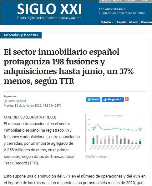 El mercado transaccional en el sector inmobiliario español ha registrado 198 fusiones y adquisiciones, entre anunciadas y cerradas, por un importe agregado de 2.355 millones de euros, en el primer semestre, según datos de Transactional Track Record (TTR).