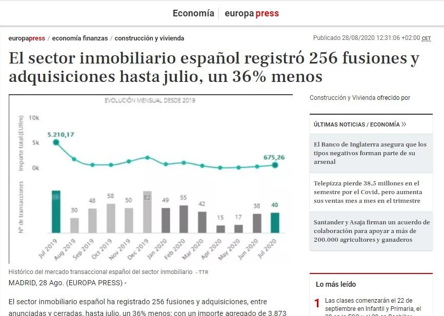 En los primeros siete meses de 2020, las operaciones en el sector inmobiliario lideran el mercado transaccional español, por encima del sector de tecnología, con 199 operaciones; financiero y de seguros, con 82 transacciones; y de salud, higiene y estética, con 74 negocios realizados.