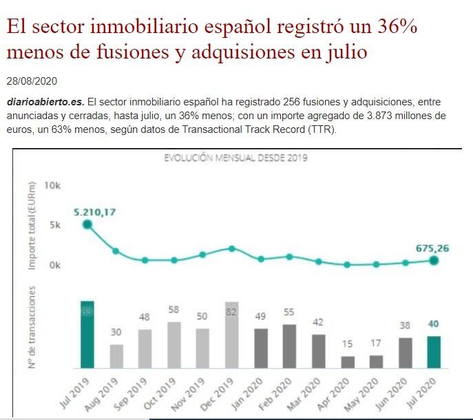 El sector inmobiliario español ha registrado 256 fusiones y adquisiciones, entre anunciadas y cerradas, hasta julio, un 36% menos; con un importe agregado de 3.873 millones de euros, un 63% menos, según datos de Transactional Track Record (TTR).