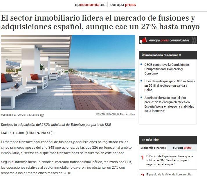 Según el informe mensual sobre el mercado transaccional ibérico, realizado por TTR, las operaciones relativas al sector inmobiliario cayeron, no obstante, un 27% con respecto a los primeros cinco meses de 2018.