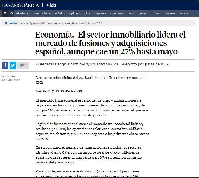 El sector inmobiliario lidera el mercado de fusiones y adquisiciones espaņol, aunque cae un 27% hasta mayo