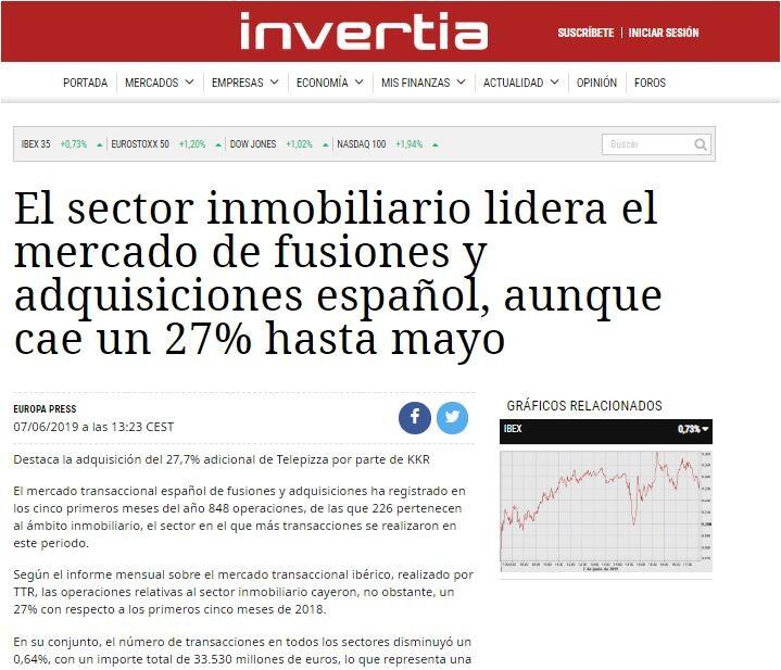 El sector inmobiliario lidera el mercado de fusiones y adquisiciones espaņol, aunque cae un 27% hasta mayo