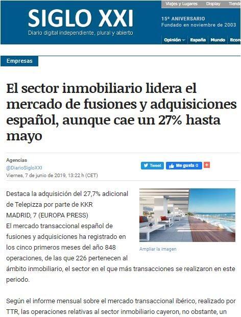 Según el informe mensual sobre el mercado transaccional ibérico, realizado por TTR, las operaciones relativas al sector inmobiliario cayeron, no obstante, un 27% con respecto a los primeros cinco meses de 2018.