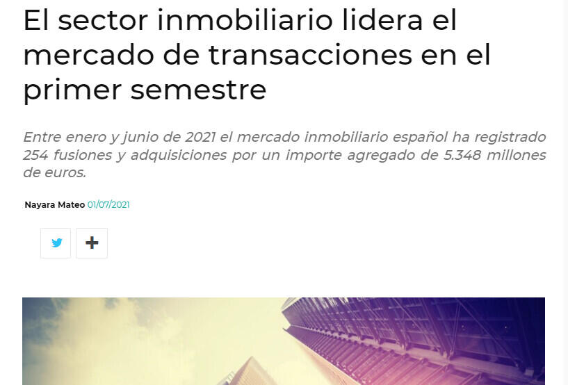 Entre enero y junio de 2021 el mercado inmobiliario español ha registrado 254 fusiones y adquisiciones por un importe agregado de 5.348 millones de euros.