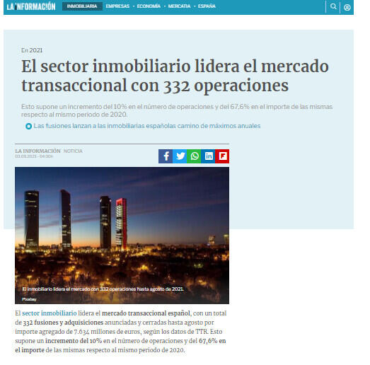 El sector inmobiliario lidera el mercado transaccional español, con un total de 332 fusiones y adquisiciones anunciadas y cerradas hasta agosto por importe agregado de 7.634 millones de euros, según los datos de TTR. Esto supone un incremento del 10% en el número de operaciones y del 67,6% en el importe de las mismas respecto al mismo periodo de 2020.