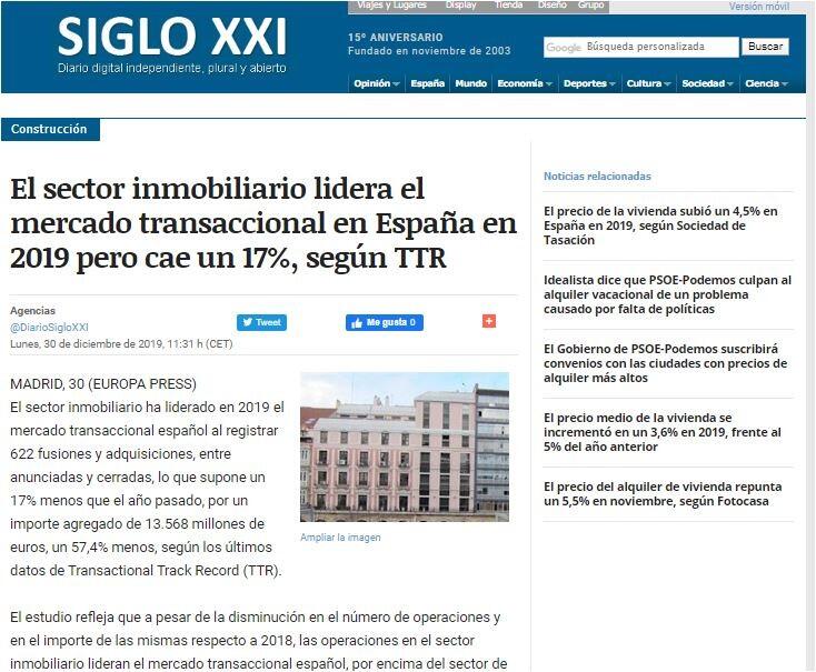 El sector inmobiliario ha liderado en 2019 el mercado transaccional español al registrar 622 fusiones y adquisiciones, entre anunciadas y cerradas, lo que supone un 17% menos que el año pasado, por un importe agregado de 13.568 millones de euros, un 57,4% menos, según los últimos datos de Transactional Track Record (TTR).