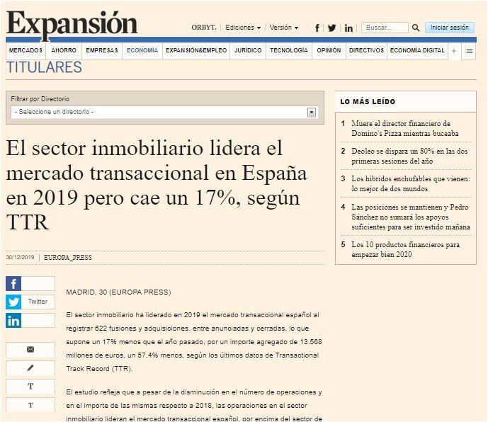 El sector inmobiliario ha liderado en 2019 el mercado transaccional español al registrar 622 fusiones y adquisiciones, entre anunciadas y cerradas, lo que supone un 17% menos que el año pasado, por un importe agregado de 13.568 millones de euros, un 57,4% menos, según los últimos datos de Transactional Track Record (TTR).