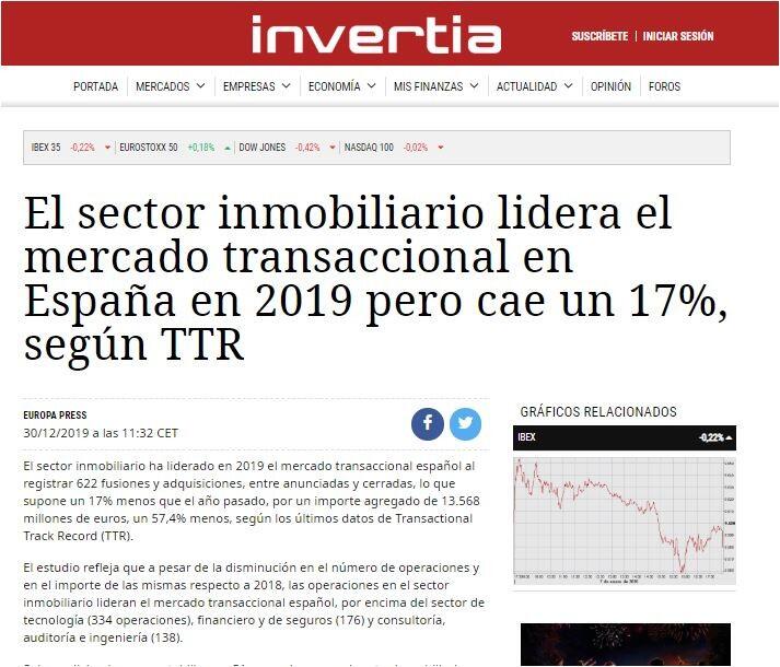 El sector inmobiliario ha liderado en 2019 el mercado transaccional español al registrar 622 fusiones y adquisiciones, entre anunciadas y cerradas, lo que supone un 17% menos que el año pasado, por un importe agregado de 13.568 millones de euros, un 57,4% menos, según los últimos datos de Transactional Track Record (TTR).
