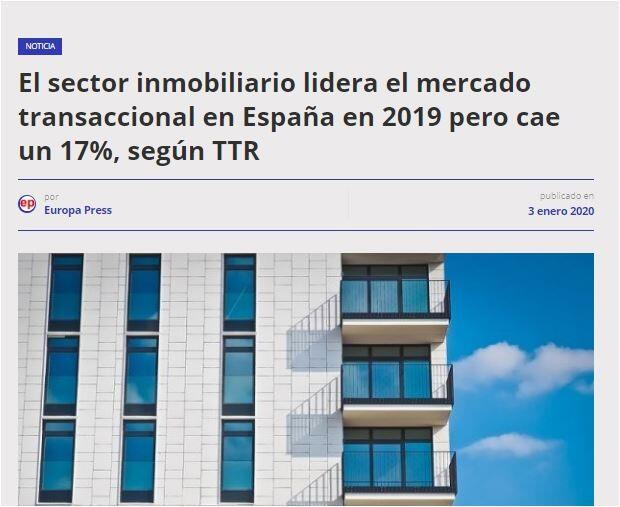 El sector inmobiliario ha liderado en 2019 el mercado transaccional español al registrar 622 fusiones y adquisiciones, entre anunciadas y cerradas, lo que supone un 17% menos que el año pasado, por un importe agregado de 13.568 millones de euros, un 57,4% menos, según los últimos datos de Transactional Track Record (TTR).