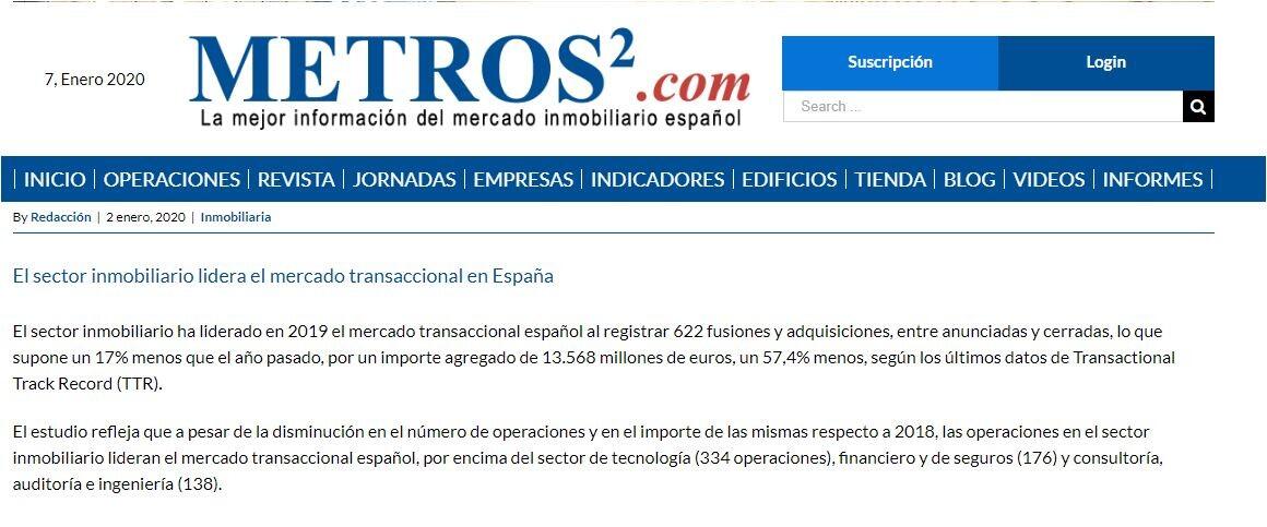 El sector inmobiliario ha liderado en 2019 el mercado transaccional español al registrar 622 fusiones y adquisiciones, entre anunciadas y cerradas, lo que supone un 17% menos que el año pasado, por un importe agregado de 13.568 millones de euros, un 57,4% menos, según los últimos datos de Transactional Track Record (TTR).