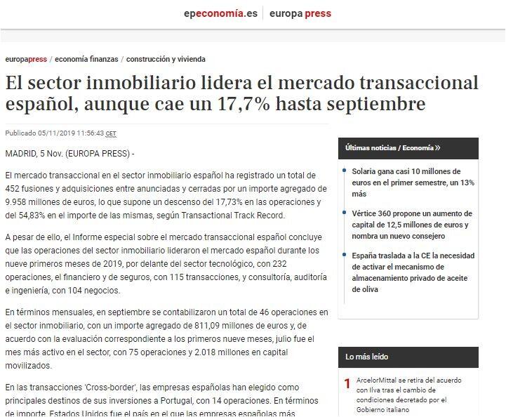 A pesar de ello, el Informe especial sobre el mercado transaccional español concluye que las operaciones del sector inmobiliario lideraron el mercado español durante los nueve primeros meses de 2019, por delante del sector tecnológico, con 232 operaciones, el financiero y de seguros, con 115 transacciones, y consultoría, auditoría e ingeniería, con 104 negocios.