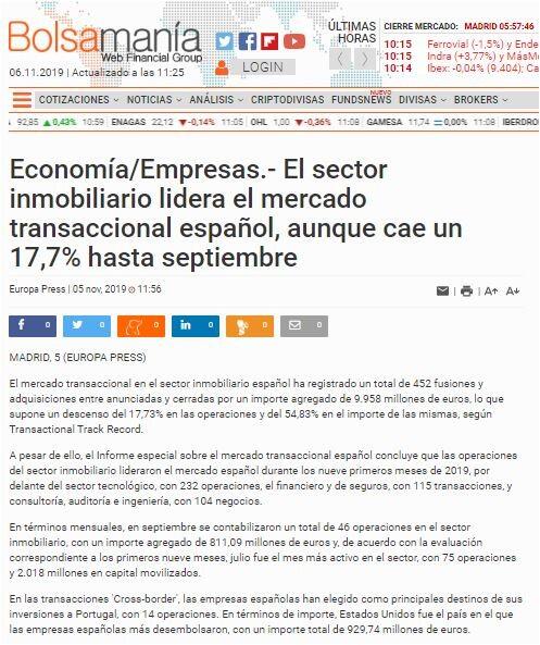 A pesar de ello, el Informe especial sobre el mercado transaccional español concluye que las operaciones del sector inmobiliario lideraron el mercado español durante los nueve primeros meses de 2019, por delante del sector tecnológico, con 232 operaciones, el financiero y de seguros, con 115 transacciones, y consultoría, auditoría e ingeniería, con 104 negocios.