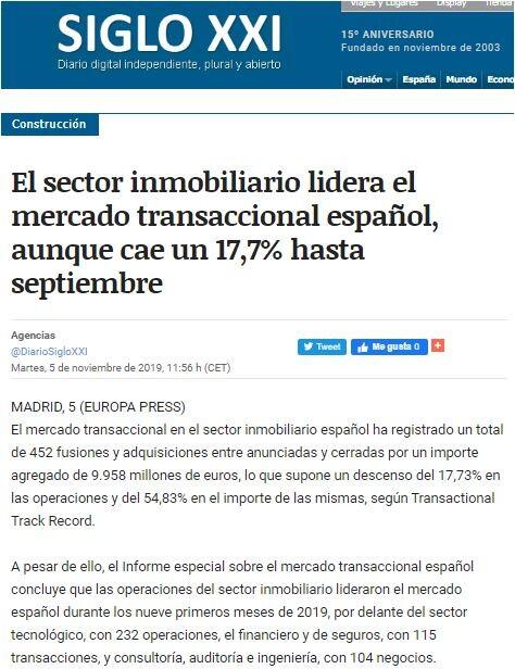 A pesar de ello, el Informe especial sobre el mercado transaccional español concluye que las operaciones del sector inmobiliario lideraron el mercado español durante los nueve primeros meses de 2019, por delante del sector tecnológico, con 232 operaciones, el financiero y de seguros, con 115 transacciones, y consultoría, auditoría e ingeniería, con 104 negocios.