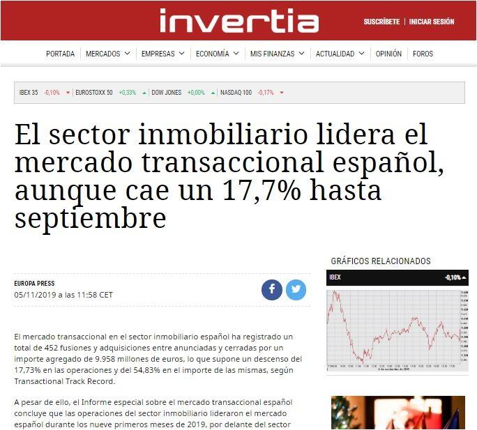 A pesar de ello, el Informe especial sobre el mercado transaccional español concluye que las operaciones del sector inmobiliario lideraron el mercado español durante los nueve primeros meses de 2019, por delante del sector tecnológico, con 232 operaciones, el financiero y de seguros, con 115 transacciones, y consultoría, auditoría e ingeniería, con 104 negocios.